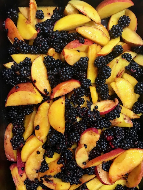 This summer time family favorite was made with freshly picked blackberries and peaches from our block in SE Portland. I was inspired by this delightful recipe on Food and Wine. I simplified it slightly, and it’s become a seasonal staple in our house.